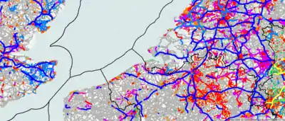 - Lo stile mappaint velocità massima mostra il valore di velocità massima su strade con un sottofondo colorato.