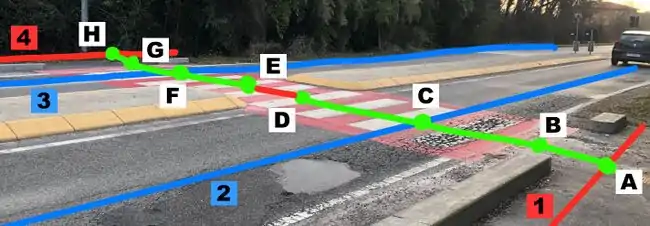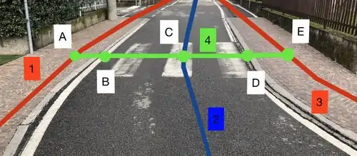 Lo schema usato per mappare gli attraversamenti è quello rappresentato in figura. Ogni attraversamento è considerato composto da 5 nodi (A-B-C-D-E) che formano la way (4). Le way (1) e (3) rappresentato i marciapiedi, la way (2) rappresenta la strada. Attraversamenti più complessi sono considerati sempre composti da 5 nodi.