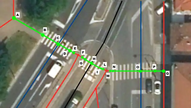 Sono rappresentate in rosso i marciapiedi, in verde gli attraversamenti, in nero i binari del tram e in blu le strade.