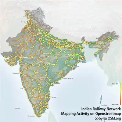 Beginning early 2010, tracing of the railway network was started by using Landsat imagery as the source. Using this, large parts of the network in the northwest and southern India were mapped almost completely. The featureless terrain permitted easy identification of the railroad lines even in low resolution imagery.