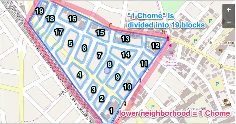 以下の図は、"千葉県 千葉市 中央区 松波 一丁目" の区画を表しています。この区域は19の街区(block)に分けられており、それぞれに番号が付与されています。これにより、 "一丁目" の中に存在しているそれぞれの区画の街区番号が確定します。