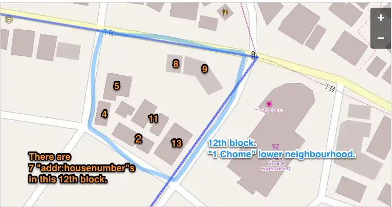 - addr:quaterとして "X丁目"の情報が存在しない場合、残りの数字は、以下の2つのどちらかの可能性がある