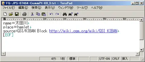 - もともとの記載の内容では place=hamletとなりますが、改定の後の処理では、その内容をそのまま利用するのではなく、記載内容を適宜 place=quarter ((市町村以下の)町名、大字)、あるいはplace=neighbourhood (丁目、小字) に分割した処理が必要です。