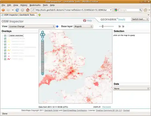 - Fabian Schmidtによるこの ODbL カバー率オーバーレイ は世界中の道路及び鉄道の"ライセンス状態"を表示します。あるオブジェクトの履歴の全ての面が考慮されているわけではないことに注意してください。このウェブサイトはとても有用でしたが、OSMInspector マップにより、広く置き換えられてしまいました。