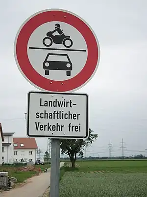 オランダの標識は農業用トラクターという車種を示し[2]現在の使用目的とは関係ありません。したがって、access=agriculturalではなくagricultural=designatedと(他の道路利用者のためのタグとともに)タグ付けすべきです。