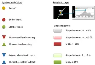 - Labels with green triangle indicate a crossing of an elevation level in upward direction, red in downward.