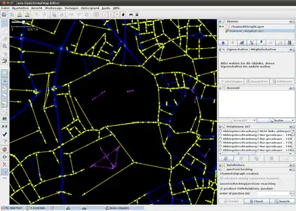 Junctionchecking is a plugin for JOSM based upon the RoadNetworkAlgorithms which identifies junctions as sets of channels in terms of their locomotion affordance: e.g. a 3-way junction affords people to move from every one of 3 junction entries to every one of its 3 exits (n times n). An example is a T intersection. So a junction is a road network feature that allows for a certain kind of constrained navigational choice. Classical 4-way junctions are e.g. cloverleaf interchanges. Note that from an affordance perspective, the junctions found may not always perfectly correspond to what you would intuitively consider the junction, since it may contain smaller parts that already satisfy the affordance criterion. Therefore our definition is based additionally on a minimality criterion. There are also road configurations that look similar but do not allow for n times n ways. Note that the algorithm is roughly quadratic in the number of channels you search in, so to search in large amounts of data is not recommendable. Note also that the correctness of the algorithm is dependent on the availability and correctness of turn-off-restrictions specified in the OSM "restriction relation". In case these are missing, the algorithm makes the (often false) assumption that all turn-offs are allowed. The plugin and the channel digraph theory is developed at the SeresII working group at the institute for geoinformatics at the university of Münster.