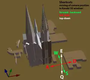 With some keys from the keyboard or moving the mouse with a pressed button in the Kendzi 3D window, you can do the following movements of the camera. Holding a directional key for a duration of time increases the speed.