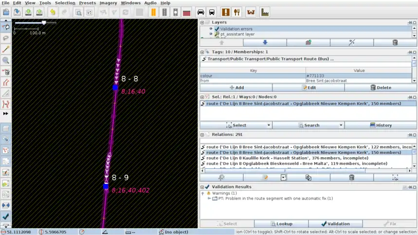 | 1 | PT: Route type does not match the type of the road it passes on | The route type (e.g. bus/tram/train etc.) has to pass on a way that matches that type, e.g. trains need rails and buses should not pass on streets that are for pedestrians or bicycles only. | JOSM zooms in to the problem, selects the problematic way(s) and opens a relation editor for the corresponding route. | darya |