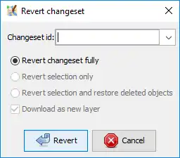 - If the changeset to be reverted deleted objects, the plugin will undelete it (i.e. remove the deleted flag). The id of the object will stay the same and the history is conserved as is (the object will not be uploadable immediately if its tags, geometry or members are left as is, because the internal version of an undeleted object is still not marked as dirty and the undeleted object is is still not part of the "modified" objects list of the editor).