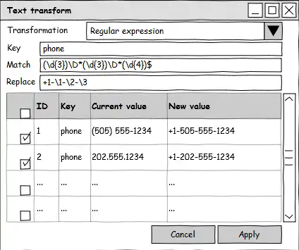 The GUI mockups above give an indication of what the dialog would look like. The plugin will only consider selected objects, so we can take advantage of all the powers of JOSM's built-in search tool. "Transformers" will themselves be plugin-like, or at the very least implement a common base class. A simple signature might be OsmObject transform(OsmObject input), as it could then perhaps automatically filter by region, or ignore objects with a certain ID number, last author, version, etc.