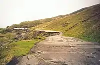 Subsided former turnpike road in Derbyshire, UK, abandoned in the 1970s as a result of a landslide. Still somewhat passable on foot and by bicycle, so it retains a (new, different) highway tag, and a reference number. |