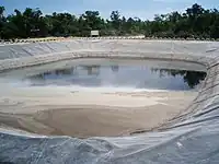 | basin | evaporation | A basin containing water containing a dissolved substance (precipitate). These basins are used for harvesting precipitate, removing the water from hazardous waste, evaporating the precipitation that falls on a contaminated site, or preventing pesticides, fertilizers, and salts from agricultural wastewater from contaminating the water bodies they would flow into. | ![]() |