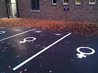 Women only parking next to the entrance. Marked with a painted "key" symbol representing female. |