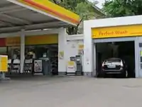 Indicates that a service station has integrated a car washing system into the building. Only one car can be washed at the same time.