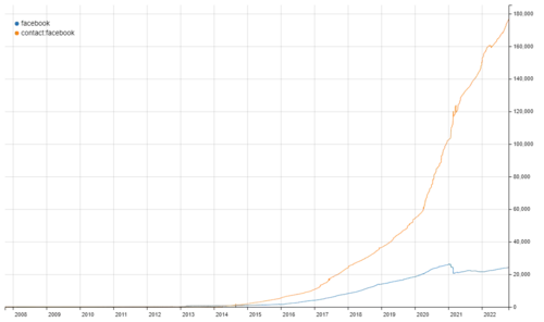 These tags are two equal means of documenting official Facebook contact channels. Both are in use and popular among mappers. As of February 2021, "facebook" tag was used by 2500 unique mappers and "contact:facebook" by 5500 unique mappers.