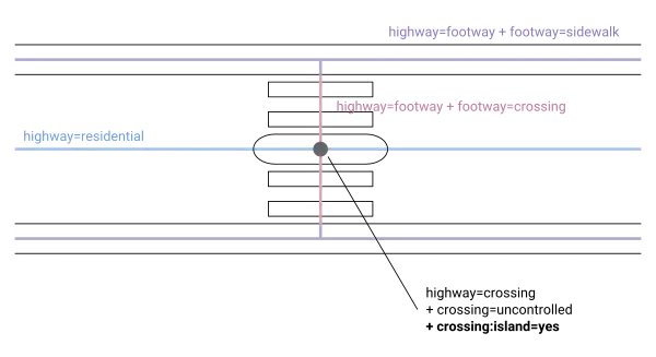 The crossing:island=* key can be used on a pedestrian crossing node highway=crossing (or alternatively on a pedestrian crossing way highway=footway + footway=crossing). Possible values are yes and no. It is recommended to further specify the type of the pedestrian crossing using the crossing=* key.