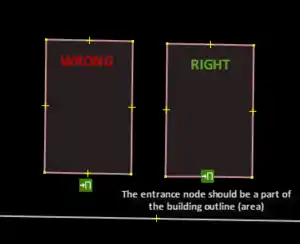 - Relations of type=building which, for indoor mapping, should at least have one member with the role "entrance"