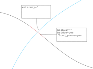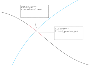To map a simple floodway crossing that does not have a bridge-like structure. Apply a tunnel=culvert tag to the waterway, and put flood_prone=yes on the intersecting highway.