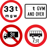 | Legal access restriction for vehicles with a max allowed weight above the specified weight in metric tonnes. |