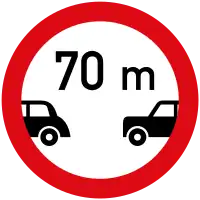Tag the roadway subject to the restriction with mindistance=##, where ## is the minimum number of meters on the sign, for example mindistance=50 for a 50-metre (160 ft) minimum distance. In regions that measure road distances in non-metric units, specify the unit explicitly, for example mindistance=30'6" for a 30-foot-6-inch (9.30 m) minimum distance.