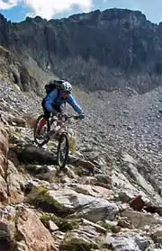 | mtb:scale=2 | Obstacles such as large rocks and stones. Soil is often loose. Steps are expected. Wider hairpin turns, steepness of up to 70%. Requires some advanced riding skills.