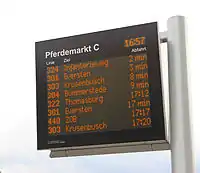 A real-time passenger information system shows the expected departure time or the time left until the departure of buses and or trams. departures_board=* however allows for more values.