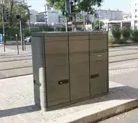 ![]() Postal street relay, France | street_cabinet=postal_service hinge=horizontal operator=La Poste Domain specific: | A small French brown street cabinet currently used by national postal services to relay letters and parcels prior to their local distribution. map |