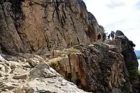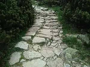 | surface | rock | Big pieces of rock used to improve path quality or exposed bare rock, including trails across natural=bare_rock. Typically in mountainous areas. | ![]() ![]() | |