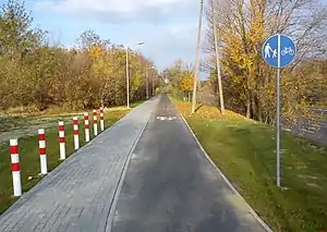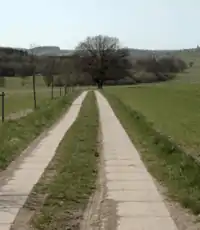| surface | concrete:lanes | Long, narrow concrete elements for a two-tracked vehicle (motorcars) so that the tires always hit the concrete. There might be sand, ground, grass, pavers, asphalt, etc. in between them. Note that if you tag a single-tracked way you just use concrete, since there are no lanes. | ![]() | |