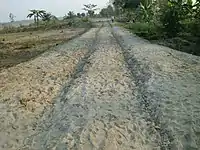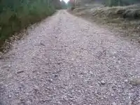 | surface | fine_gravel | A multilayer pavement with a stone or gravel basis and a topmost surface of firm, granular grit, basalt or quartz, as invented by the Roman empire. Easy to walk, jog, cycle or ride on. In hilly areas mostly with drainage channels and concave cross-section for proper water shedding. Motorized vehicles will not move stones if the way is maintained properly, and bicycles tires will not leave any imprints at least in dry weather. If the topmost surface is eroded or loose gravel aggravate please use gravel instead. | ![]() | |