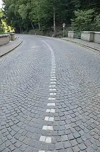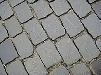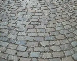 | surface | sett | Sett paving, formed from natural stones cut to have roughly a flat top, with a regular or irregular shape. The stones do not cover the surface completely, unlike paving_stones. They also may be not entirely flat. | ![]() ![]() ![]() | |