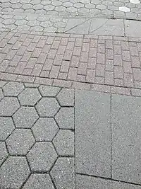 | surface | paving_stones | A relatively smooth surface paved with artificial blocks (block pavers, bricks) or natural stones (specifically, flagstones), with a flat top. The gaps between individual paving stones are very narrow, either because the stones have a perfectly regular shape (rectangular, or any surface-filling shape) or because they have been carefully selected, fitted and placed in order to form an even, closed surface. | ![]() ![]() ![]() | |