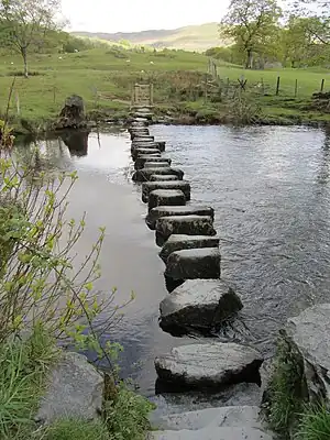 | surface | stepping_stones | Stones or plates individually arranged in a row, allowing to walk on, surrounded by an unpaved medium such as grass or water | ![]()