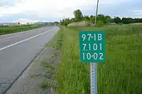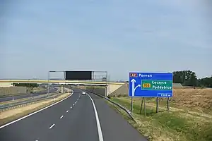 ![]() Road in Poland with a barely visible road reference marker, not intended to be a reassurance used for navigation. Tagged with unsigned_ref=* | ![]() Road in Poland with a sign displaying road code in format being readable for driver travelling at motorway speed. Tagged with ref=* |