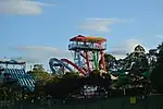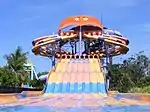 | water_slide=funnel | Riders drop from inside a tunnel out into the ride's main element shaped like a funnel on its side. Riders oscillate from one side to the other until they exit through the back of the funnel and into a splash pool. | ![]() |