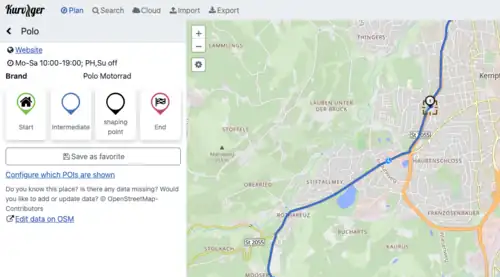 Most routing software tries to find the fastest way to the motorway and route along the motorway. Kurviger however, tries to use curvy backcountry roads where possible. Also, Kurviger enforces motorcycle access rules and not car access rules. Due to that we find a lot of minor issues in the OSM data that might not be found by other routers. Kurviger makes it easy to edit data in OSM. You can right click on the map and open the exact same map view on the OSM website. In addition to that, for some of the more advanced features like POIs or road closures, we offer links to the OSM id to make this even easier.