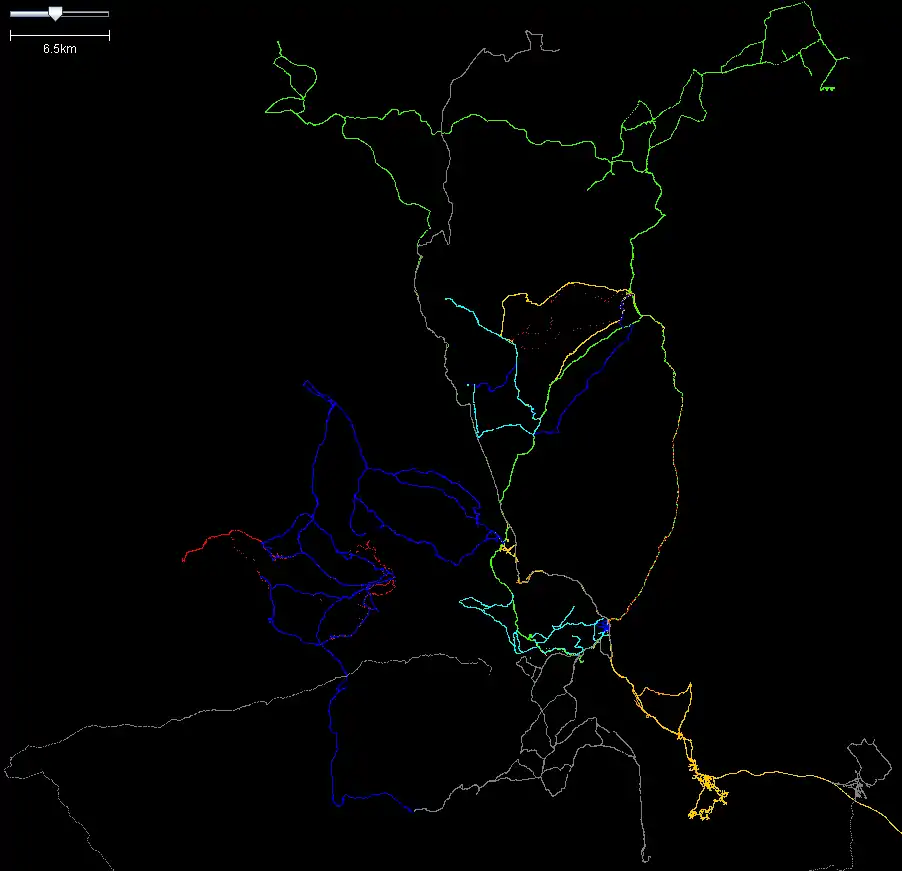 Screenshot of GPS traces produced, coloured for individual contributors (whose time varied from just the weekend to several days). Does not include long run in to area by blackadder, and a long drive by Steve8 to pick up main access road to Lakes from South.