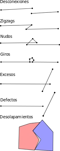 Los errores topologicos son aquellos que no cumplen con estas reglas: por ejemplo, dos líneas que representan carreteras que al cruzarse al mismo nivel no tienen un nodo en común en la intersección (overshoots), o dos polígonos que representan láminas de agua que se solapan (slivers).
