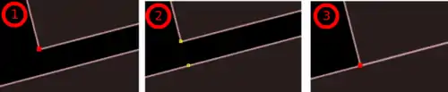 Si aún así hemos detectado que aún existen algún gap entre polígonos vecinos cuyos bordes siguen sin coincidir (1), repetiremos la operación o lo corregiremos manualmente añadiendo un nodo en uno de los lados próximo al nodo erróneo, tal y como muestra la imagen (2), y seleccionando ambos nodos mediante Herramientas --> Unir nodos (o tecla M). Ahora solo existirá un único nodo compartido (3).