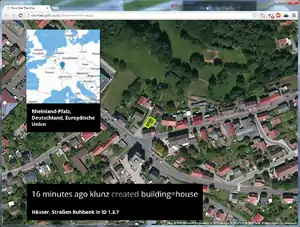 | Show me the way | Art, OSM tool | English | Shows near live edits (ways and nodes) overlaid on bing aerial imagery and shows a small overview OSM map (MapBox tiles). No "Pause" button or "previous" button (could be improved to be usable as anti-vandalism tool). Seems to use Overpass API/Augmented Diffs as data source. | ? github |