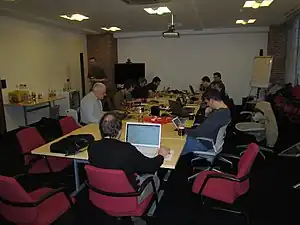 We mostly take a fairly unstructured free-form format. People turn up and start beavering away on something, or they turn up and see what they can help with. However we can also run more structured workshops if there is demand