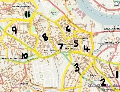 There are mainline stations New Cross and New Cross Gate are in the area for mapping. They are in TFL Travel Card zone 2. There are trains every half hour to Crystal Palace, which has connections South to places like Sutton. The DLR is on the western edge of the mapping area.