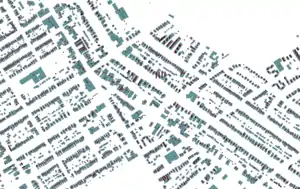 Sample of address data overlayed on building data. Note that addresses are centered over the center of the building footprint, if there is a building. Then they are centered on the parcel (parcels not shown in this image). In the case of condos, they are stacked and slightly offset.
