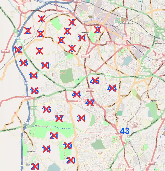 | 36 | brianboru | --Brianboru 16:02, 24 November 2008 (UTC) | Not on cake. Area to east of area 35 & 38 and south of Kings Norton Station up to limit of A441 |