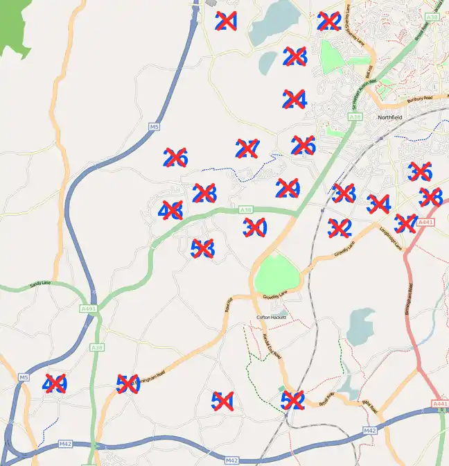 | 51 | brianboru | --Brianboru 15:29, 21 December 2008 (UTC) | Area to south of Lickey (residential?) yes - around Cofton Hackett |