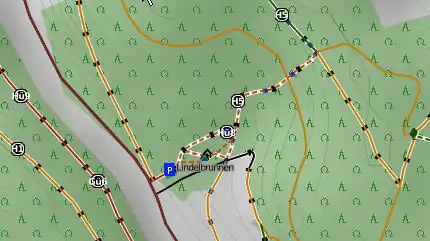 Um sich die Wanderwege Online darstellen zu lassen ist folgende Seite empfehlenswert OSMC Reit- und Wanderkarte. Hier gibt es auch eine schöne Karte für Garmingeräte zum herunterladen. Beim Hereinzoomen werden die lokalen Wanderwege sichtbar. Wie im Beispielbild vom Lindelbrunnen.