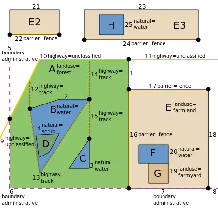 Way 23 is added and not tagged. Way 24 is added and tagged with barrier=fence. Way 23 and 24 are forming farmland E3 which is separated from but belongs to farmland E. Closed way 25 is added within farmland E3 and tagged with natural=water describing lake H. Multipolygon A stays unchanged: Relation A: type=multipolygon landuse=forest outer 1 outer 16 outer 6 outer 10 inner 2 inner 13 inner 3 Multipolygon B stays unchanged: Relation B: type=multipolygon natural=water outer 2 outer 13 inner 4 outer 21, outer 22, outer 23, outer 24 and inner 25 are added to multipolygon E: Relation E: type=multipolygon landuse=farmland outer 7 outer 16 outer 17 outer 18 inner 19 inner 20 >outer 21 >outer 22 >outer 23 >outer 24 >inner 25 |
