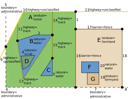 | The former way 1 gets split again into a new short way 1 and a new way 16 which is tagged with barrier=fence. Way 17 is added and tagged with barrier=fence. Way 18 is added and not tagged. Ways 7, 16, 17 and 18 are forming the boundary of farmland E which is adjacent to forest A. They share the way 16. Closed way 19 is added inside farmland E and tagged with landuse=farmyard describing farmyard G. Closed way 20 is added by using the two northern nodes of way 19 and drawing a duplicate way on top of the northern boundary of farmyard G. Way 20 is tagged with natural=water describing a third lake F.
