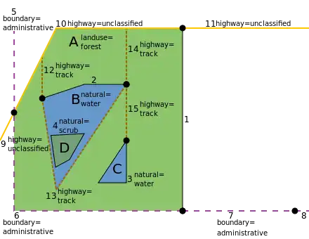 Remark: the usage of highways (linear element) as boundaries (multipolygon or not) for landuse (area element) is basically discouraged. This because later shifting, nudging or reshaping the highway or area immediately results in the not often intended change of the connected area resp. highway. More importantly the vast majority of (less technical) mappers cannot be expected to ever grasp advanced multipolygons. Overusing advanced multipolygons like in this example will either prevent those mappers from participating or down the road guarantee the destruction of these multipolygons. Also note that including highways in advanced multipolygons like in this example, vastly complicates later editing of those highways (physical modifications to roads happen all the time). Far from all mappers can be expected to have the skills or time to handle this gracefully. Way 2 used to be the whole boundary of lake B is also split. The ways 12, 13, 14 and 15 are added and tagged with highway=track. There are own map features for ways 5 to 15 and thus they are tagged with them regardless whether they are members of multipolygons because they aren't areas. The "remaining" way 1 and the ways 6 and 10 are now forming the boundary of forest A. outer 6, outer 10 and inner 13 are added to multipolygon A: Relation A: type=multipolygon landuse=forest outer 1 >outer 6 >outer 10 inner 2 >inner 13 inner 3 The ways 2 and 13 are forming the boundary of lake B. outer 13 is added to multipolygon B: Relation B: type=multipolygon natural=water outer 2 >outer 13 inner 4 |